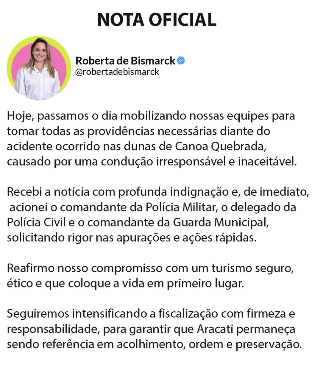 A conduta também foi criticada pela prefeita da cidade, Roberta de Bismarck. “Mobilizamos nossas equipes para tomar todas as providências diante de um fato lamentável ocorrido nas dunas de Canoa Quebrada. Entrei em contato com o Cel. Kléber (PM), o delegado Ricardo (PC) e o comandante Marcos Vinícius (Guarda Municipal) para definirmos ações firmes e imediatas diante da condução irresponsável que ganhou repercussão nas redes“, escreveu em nota postada no Instagram.
