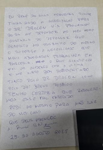 A carta foi escrita em meio à terceira mudança de advogados. Inicialmente, uma equipe de defensores assumiu o caso, mas renunciou no dia 18 de agosto, alegando “motivos de foro íntimo”. Na sequência, Dracon Cavalcanti Lima assumiu a defesa, mas, nesta segunda (25), relatou ter sido surpreendido pelo registro de um novo advogado, Bruno Silva Rodrigues, do Rio de Janeiro.
