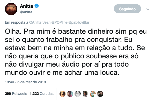 Um fã, então, comentou que 70 mil dólares para a cantora bem sucedida não era “nada”. Ela contestou a afirmação: “Olha. Pra mim é bastante dinheiro sim, porque eu sei o quanto trabalho pra conquistar. Eu estava bem na minha em relação a tudo. Se não queria que o público soubesse, era só não divulgar meu áudio por aí pra todo mundo ouvir e me achar uma louca”. Gente! Ela deu a entender que foi Pabllo Vittar que divulgou a gravação? Babado!