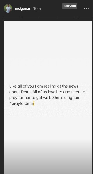Já Nick Jonas é um grande amigo de Demi. Ao saber da notícia, o cantor publicou uma mensagem no Twitter e no Instagram declarando todo apoio à cantora.