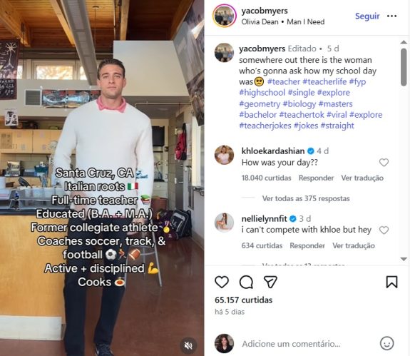 A publicação não só viralizou como chegou em Khloé. A empresária não perdeu tempo e logo deixou um comentário na postagem do pretendente que mora em Santa Cruz, na Califórnia. “Como foi o seu dia?”, perguntou ela.