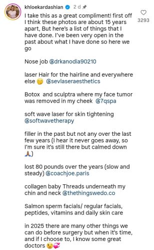 Khloé também mencionou sua perda de peso. “Perdi 36 kg ao longo dos anos (de forma lenta e constante); fios de colágeno abaixo do meu queixo e pescoço; procedimentos faciais com esperma de salmão/faciais regulares, peptídeos, vitaminas e cuidados diários com a pele. Em 2025, há muitas outras coisas que podemos fazer antes da cirurgia, mas quando chegar a hora, e se eu decidir, conheço alguns médicos excelentes”, finalizou a empresária.