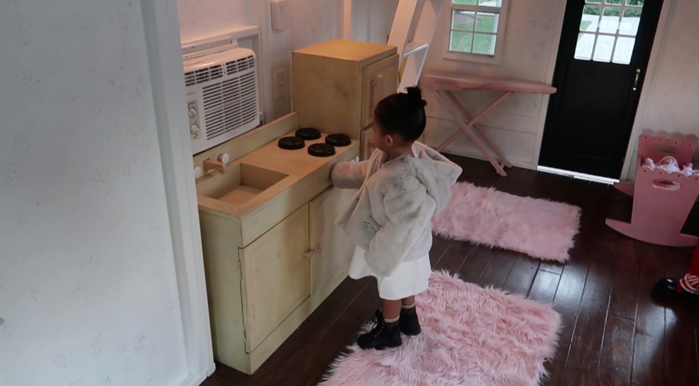 Quem também ficou impressionada com o presente foi Stormi, que resolveu explorar a casinha, toda feliz. Imediatamente, ela começou a brincar com os acessórios da cozinha, do quarto e da mesinha.