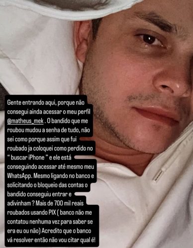 O sertanejo também contou que, apesar de nunca ter passado por uma situação assim, estava com o vidro do carro “um pouco aberto” na Marginal Pinheiros, enquanto relia algumas histórias da dupla para contar no evento, momento em que o celular foi roubado. Na manhã desta sexta (30), Matheus afirmou que conseguiu recuperar sua conta do Instagram, e que depois, irá explicar para os fãs como tudo aconteceu.