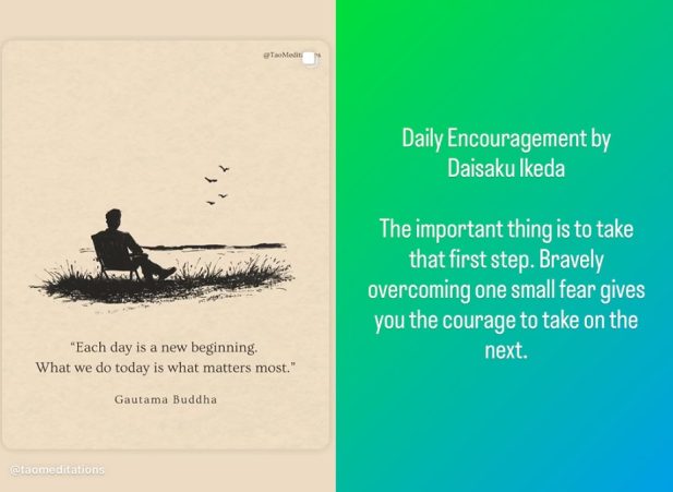 No primeiro story, ele compartilhou uma frase de Gautama Buddha que diz: “Cada dia é um novo começo. O que fazemos hoje é o que mais importa”. Em seguida, o astro publicou um “encorajamento diário” do autor japonês Daisaku Ikeda: “O importante é dar o primeiro passo. Superar bravamente um pequeno medo lhe dá a coragem para encarar o próximo.”