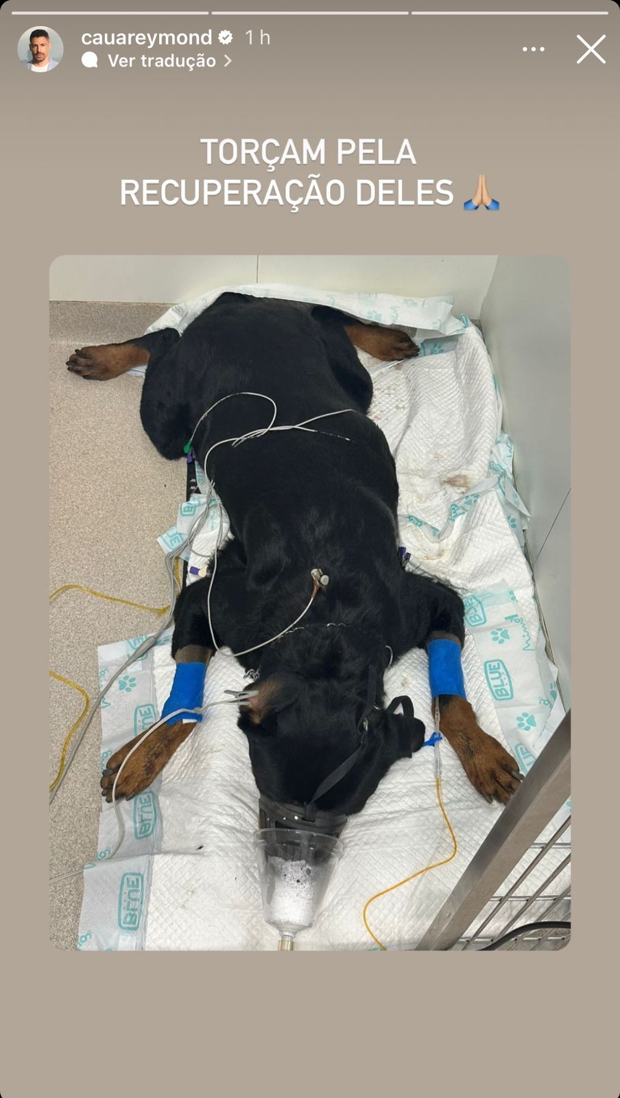 Em seguida, Cauã publicou uma foto de um dos cães sendo atendido no veterinário com a legenda: “Torçam pela recuperação deles”. Veja: