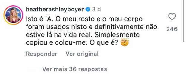 “Isso é IA. Meu rosto e meu corpo foram usados nisso e eu definitivamente não estava lá na vida real. Ele simplesmente me copiou e me colou”, escreveu Heather-Ashley