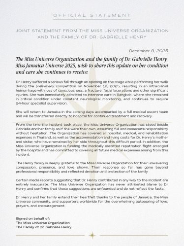 A MUO continuou: “Além disso, a Organização Miss Universo está financiando o voo de repatriação com escolta médica organizado pelo hospital e se comprometeu a cobrir todas as despesas médicas futuras decorrentes deste incidente. Certas reportagens da mídia sugerindo que a Sra. Henry contribuiu de alguma forma para o incidente são totalmente imprecisas. A Organização Miss Universo jamais atribuiu culpa à Sra. Henry e confirma que essas sugestões são infundadas e não refletem os fatos”.