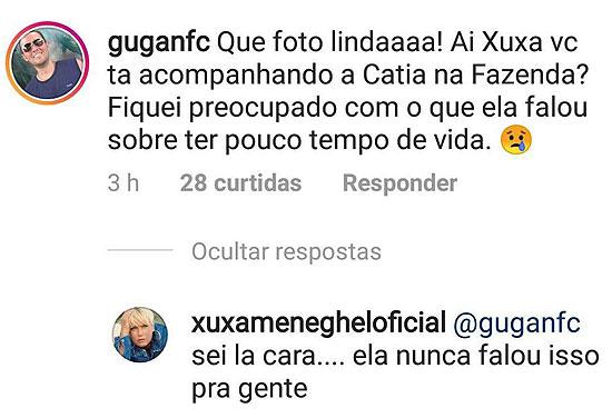 A declaração de Cátia sobre o pouco tempo de vida que lhe restaria repercutiu nas redes sociais e deixou internautas preocupados. Um deles resolveu comentar com a antiga chefe da paquita, Xuxa, que disse não saber de nada. “Você tá acompanhando a Cátia na Fazenda? Fiquei preocupado com o que ela disse sobre ter pouco tempo de vida“, publicou um rapaz numa das fotos da apresentadora no Instagram. “Ela nunca falou disso pra gente“, respondeu Xuxa.